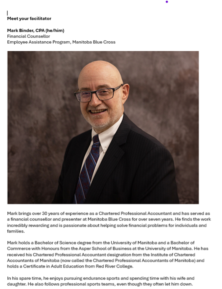 Participants will leave with a clearer understanding of how to approach financial decisions with intention, align money choices with personal values and goals, and reduce financial stress – so finances become a source of stability rather than added pressure, both personally and professionally.